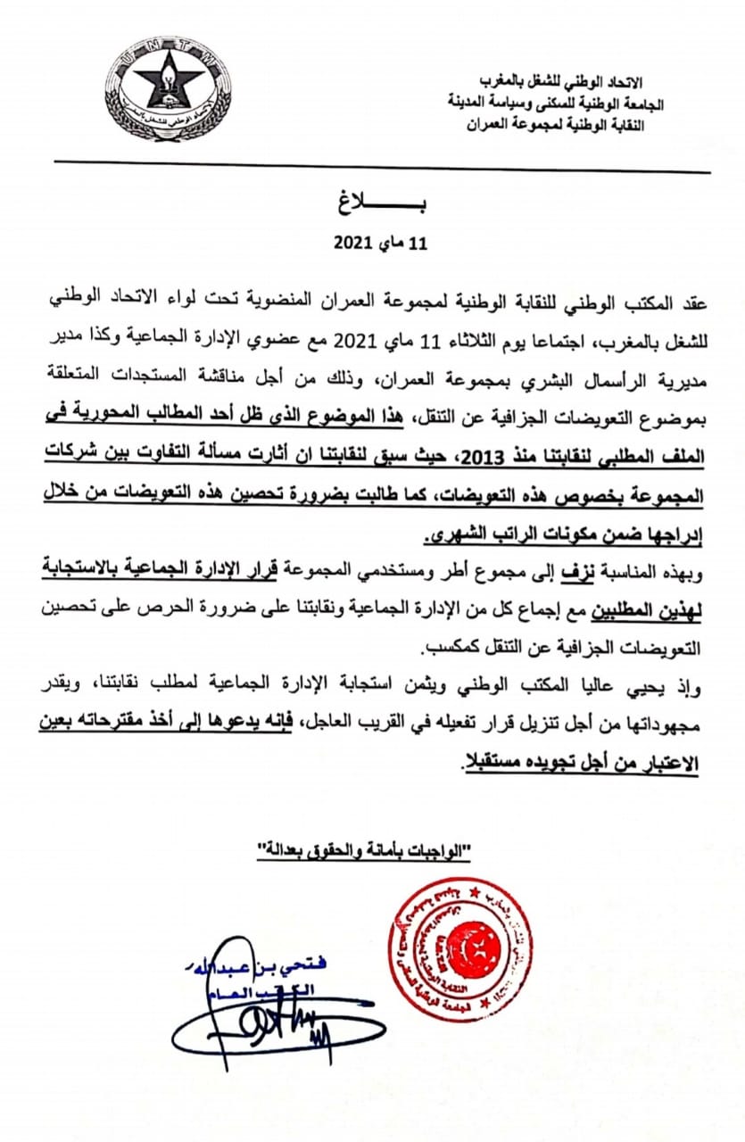 عقد المكتب الوطني للنقابة الوطنية لمجموعة العمران المنضوية تحت لواء الاتحاد الوطني للشغل بالمغرب، اجتماعا يوم الثلاثاء 11 ماي 2021 مع عضوي الإدارة الجماعية وكذا مدير مديرية الرأسمال البشري بمجموعة العمران، وذلك من أجل مناقشة المستجدات المتعلقة بموضوع التعويضات الجزافية عن التنقل، وهو الموضوع الذي ظل أحد المطالب المحورية في الملف المطلبي للنقابة منذ 2013.