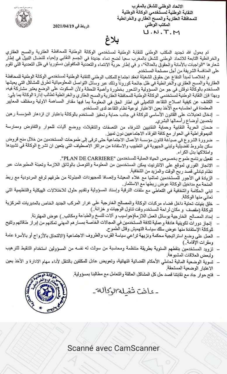 في إطار السعي لضح دماء جديدة في الجسم النقابي وإحياء للنضال النبيل انطلاقا من شعار “الواجبات بالأمانة والحقوق بالعدالة”، تم الإثنين 19 أبريل 2021، تجديد المكتب الوطني للنقابة الوطنية لمستخدمي الوكالة الوطنية للمحافظة العقارية والمسح العقاري والخرائطية التابعة للاتحاد الوطني للشغل بالمغرب.