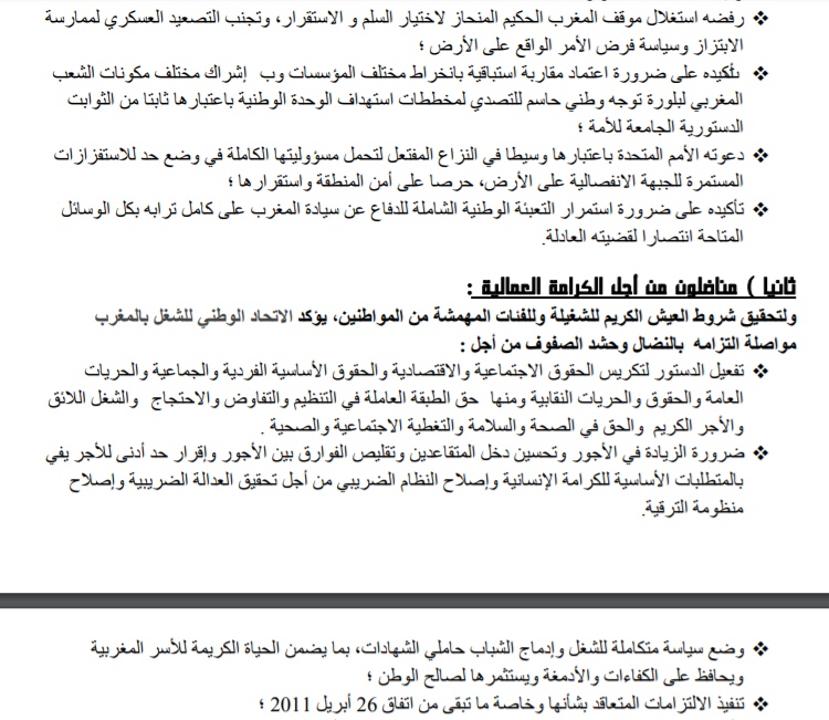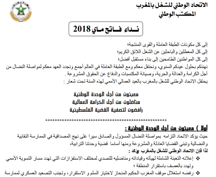 النص الكامل لنداء الاتحاد الوطني للشغل بالمغرب لفاتح ماي 2018