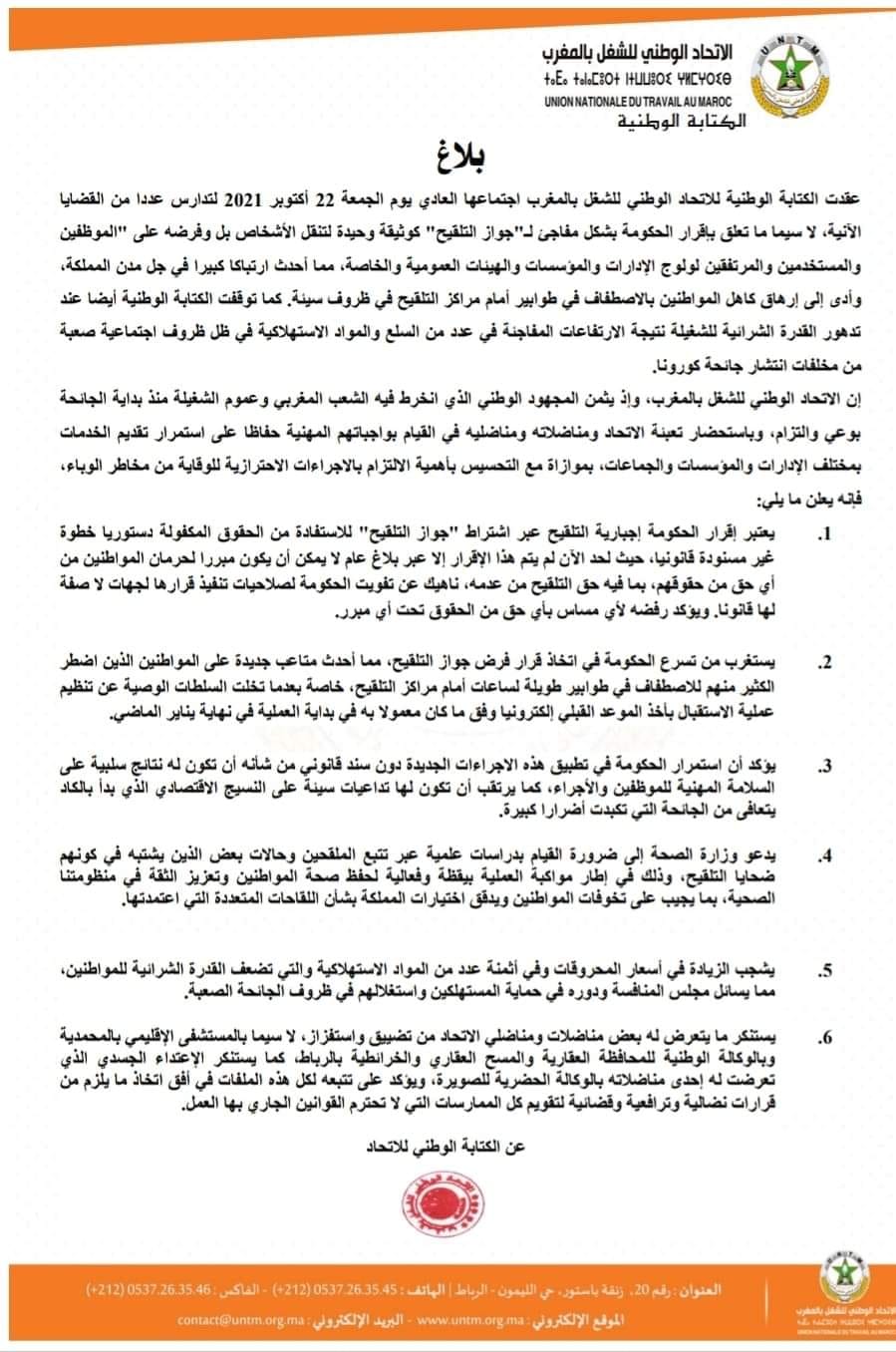 وسجل الاتحاد، خلال اجتماع كتابته الوطنية يوم الجمعة 22 أكتوبر 2021، استغرابه من تسرع الحكومة في اتخاذ قرار فرض جواز التلقيح، مما أحدث متاعب جديدة على المواطنين الذين اضطر الكثير منهم للاصطفاف في طوابير طويلة لساعات أمام مراكز التلقيح، خاصة بعدما تخلت السلطات الوصية عن تنظيم عملية الاستقبال بأخذ الموعد القبلي إلكترونيا وفق ما كان معمولا به في بداية العملية في نهاية يناير الماضي.