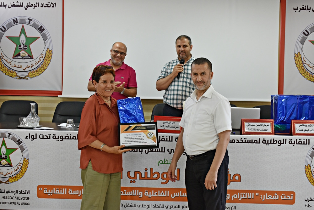واختتم المؤتمر الوطني الأول للنقابة بتكريم  كل من لحسن أزكاوي – لعزيزة أقمني – عزيز بوخريص، عرفانا لهم لما قدموه من تضحيات وتفان في الدفاع عن الشغيلة.