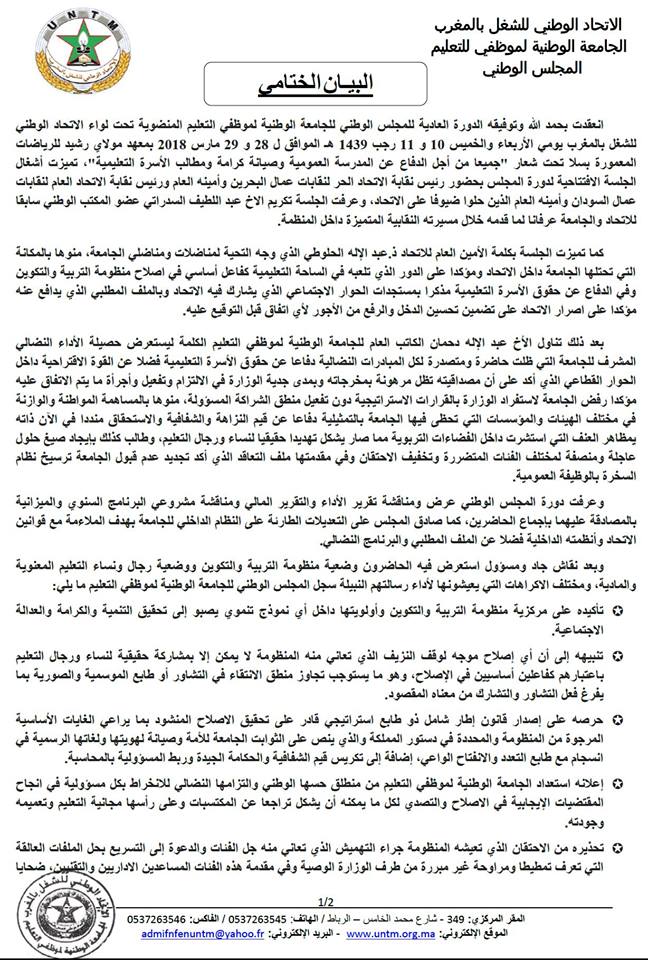 انعقدت الدورة العادية للمجلس الوطني للجامعة الوطنية لموظفي التعليم المنضوية تحت لواء الاتحاد الوطني للشغل بالمغرب يومي الأربعاء والخميس 10 و 11 رجب 1439 هـ الموافق ل 28 و 29 مارس 2018 بمعهد مولاي رشيد للرياضات المعمورة بسلا تحت شعار “جميعا من أجل الدفاع عن المدرسة العمومية وصيانة كرامة ومطالب الأسرة التعليمية”.