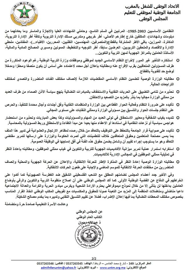 وأكد أعضاء المجلس تضامنهم المطلق مع الشعب الفلسطيني الشقيق ضد الغطرسة الصهيونية كما أكدوا على انخراطهم في الدفاع عن القضية الوطنية الأولى، كما أكد المجلس الوطني على أن اصلاح منظومة التربية والتكوين والرقي بأوضاع العاملين بداخلها لن يتأتى إلا من خلال نموذج ديموقراطي يحترم الارادة الشعبية ويكرس مبادئ الحرية والكرامة والعدالة الاجتماعية داعيا مناضلي ومناضلات المنظمة إلى المزيد من التعبئة صونا للحقوق والمكتسبات مع تفويض المكتب الوطني اتخاذ القرار المناسب بخصوص مختلف المحطات النضالية بما فيها إعلان الإضراب، فضلا عن تقييم التنسيق النقابي وتدبيره بما يخدم مصالح الشغيلة.