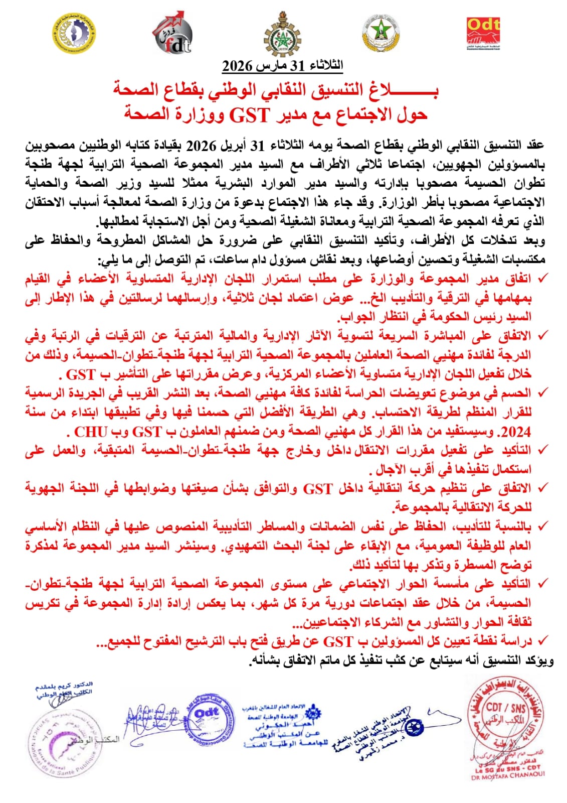 كما تم التأكيد على مأسسة الحوار الاجتماعي على مستوى المجموعة الصحية الترابية لجهة طنجة-تطوان-الحسيمة، من خلال عقد اجتماعات دورية مرة كل شهر، بما يعكس إرادة إدارة المجموعة في تكريس ثقافة الحوار والتشاور مع الشركاء الاجتماعيين…ودراسة نقطة تعيين كل المسؤولين ب GST عن طريق فتح باب الترشيح المفتوح للجميع …