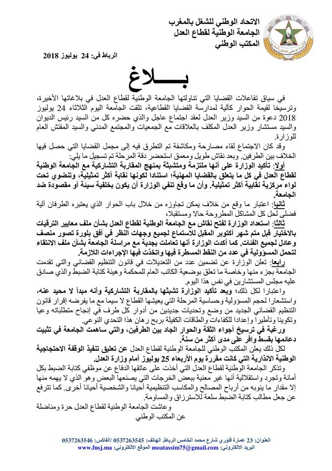 أعلنت الجامعة الوطنية لقطاع العدل المنضوية تحت لواء الاتحاد الوطني للشغل بالمغرب، تعليق تنفيذ الوقفة الاحتجاجية الوطنية الانذارية التي كانت مقررة يوم الأربعاء 25 يوليوز أمام وزارة العدل بالرباط، وذلك بعد تلقي الجامعة الثلاثاء دعوة من وزير العدل لعقد اجتماع عاجل حضره كل من رئيس الديوان ومستشار وزير العدل المكلف بالعلاقات مع الجمعيات والمجتمع المدني والمفتش العام للوزارة، أكدت خلاله الوزارة تشبثها بالمقاربة التشاركية.