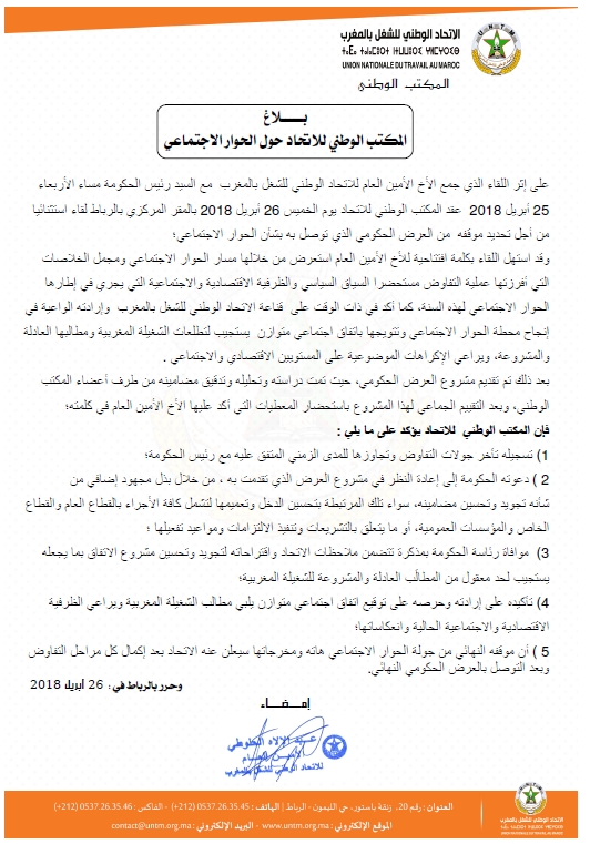 وأكد الاتحاد عقب اللقاء الاستثنائي لمكتبه الوطني الخميس 26 أبريل 2018 بمقر الاتحاد، لتحديد موقفه من العرض الحكومي الذي توصل به بشأن الحوار الاجتماعي، على إثر اللقاء الذي جمع الأخ الأمين العام للاتحاد مع رئيس الحكومة الأربعاء 25 أبريل، (أكد) على إرادته وحرصه على توقيع اتفاق اجتماعي متوازن يلبي مطالب الشغيلة المغربية ويراعي الظرفية الاقتصادية والاجتماعية الحالية وانعكاساتها.