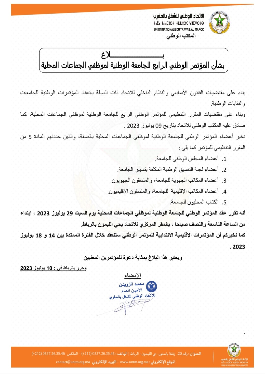 بناء على مقتضيات القانون الأساسي والنظام الداخلي للاتحاد ذات الصلة بانعقاد المؤتمرات الوطنية للجامعات والنقابات الوطنية، والمقرر التنظيمي للمؤتمر الوطني الرابع للجامعة الوطنية لموظفي الجماعات المحلية، كما صادق عليه المكتب الوطني للاتحاد بتاريخ 09 يوليوز 2023، أنهى المكتب الوطني للاتحاد إلى علم أعضاء المؤتمر الوطني للجامعة بالصفة، أنه قد تقرر عقد المؤتمر الوطني للجامعة يوم السبت 29 يوليوز 2023 ، ابتداء من الساعة التاسعة والنصف صباحا ، بالمقر المركزي للاتحاد بحي الليمون بالرباط.