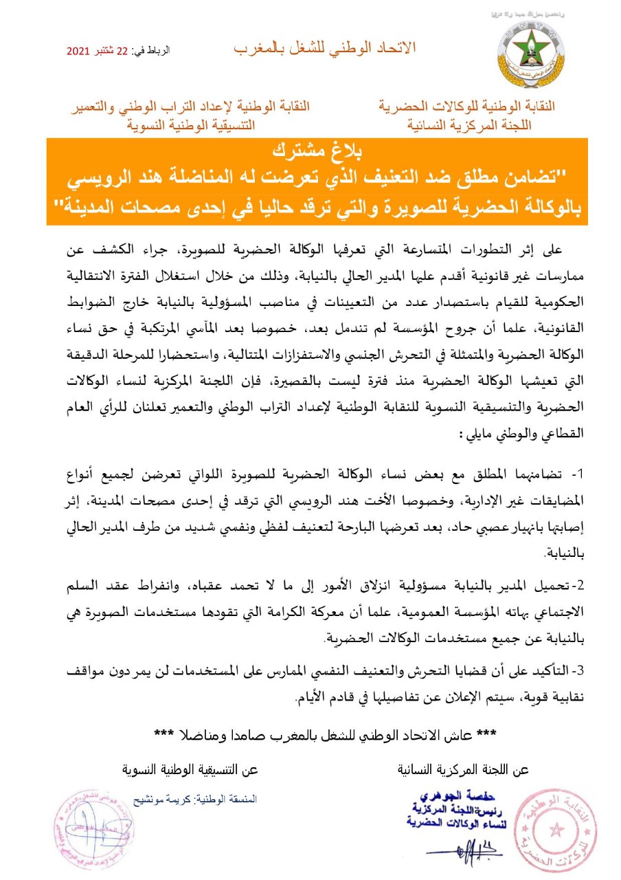 أكدت كل من اللجنة المركزية لنساء الوكالات الحضرية، والتنسيقية النسوية للنقابة الوطنية لإعداد التراب الوطني والتعمير، المنضويتان تحت لواء الاتحاد الوطني للشغل بالمغرب، تضامنهما المطلق مع بعض نساء الوكالة الحضرية للصويرة اللواتي تعرضن لجميع أنواع المضايقات غير الإدارية، وخصوصا الأخت هند الرويسي التي ترقد في إحدى مصحات المدينة، إثر إصابتها بانهيار عصبي حاد، بعد تعرضها لتعنيف لفظي ونفسي شديد من طرف المدير الحالي بالنيابة.