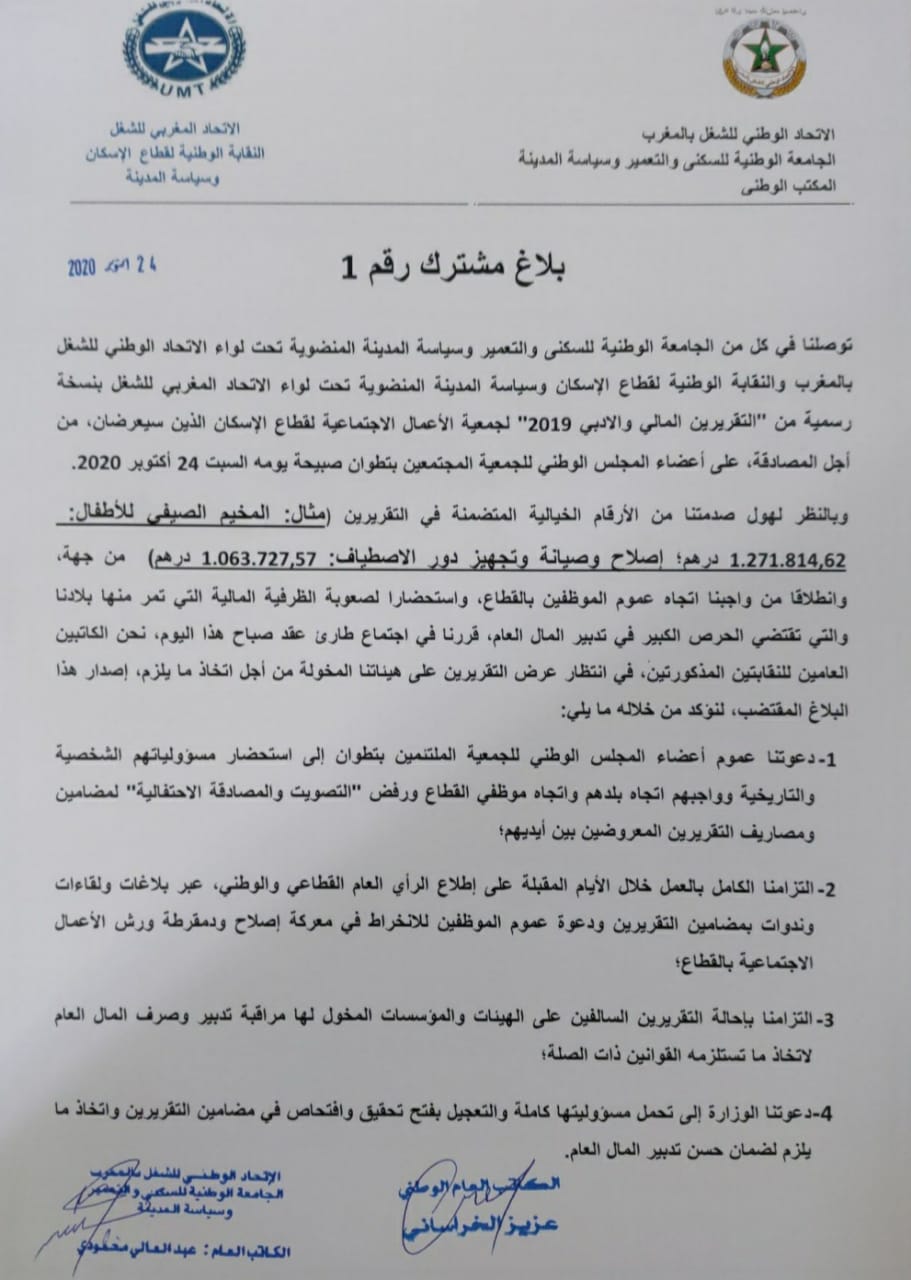 عبر تنسيق نقابي يضم كل من الجامعة الوطنية للسكنى والتعمير وسياسة المدينة المنضوية تحت لواء الاتحاد الوطني للشغل بالمغرب والنقابة الوطنية لقطاع الإسكان وسياسة المدينة المنضوية تحت لواء الاتحاد المغربي للشغل، عن تفاجئه لما تضمنه “التقريرين المالي والادبي 2019” لجمعية الأعمال الاجتماعية لقطاع الإسكان، من أرقام خيالية المخيم الصيفي للأطفال: 1.271.814,62 درهم؛ إصلاح وصيانة وتجهيز دور الاصطياف: 1.063.727,57 درهم).