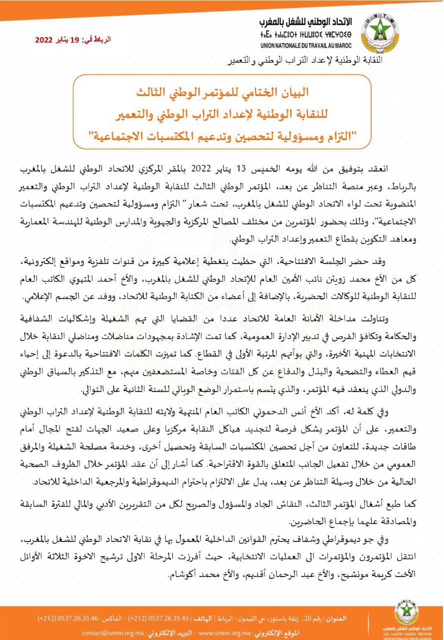 أكدت النقابة الوطنية لإعداد التراب الوطني والتعمير، المنضوية تحت لواء الاتحاد الوطني للشغل بالمغرب، على ضرورة ترسيخ مبادئ الحرية والحوار الاجتماعي والمقاربة التشاركية، حيث أكد أعضاء المؤتمر الوطني الذي انعقد الخميس 13 يناير 2022، بالمقر المركزي للتحاد بالرباط، تحت شعار “التزام ومسؤولية لتحصين وتدعيم المكتسبات الاجتماعية”، على ضرورة تعزيز الشراكة مع مسؤولي الوزارة الوصية، مع الحرص على صيانة حقوق الموظفين والدفاع عن الشفافية وتكافؤ الفرص بكل الأشكال النضالية والقانونية والإعلامية.