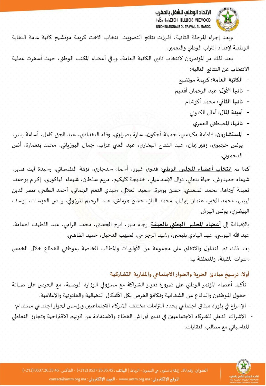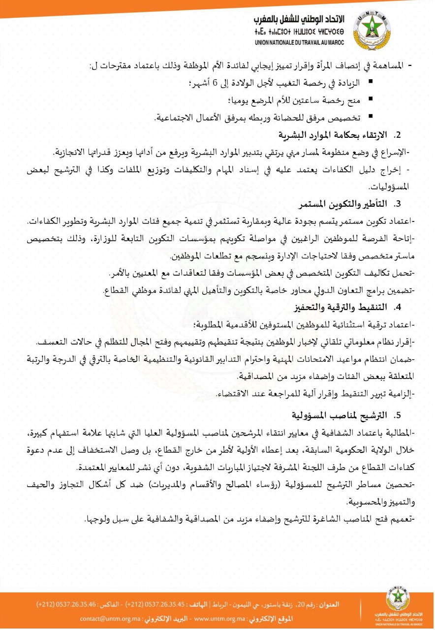 وشددة النقابة على ضرورة الإسراع في بلورة ميثاق اجتماعي يحدد التزامات مختلف الشركاء الاجتماعيين ويؤسس لحوار اجتماعي مستدام؛ والإشراك الفعلي للشركاء الاجتماعيين في تدبير أوراش القطاع والاستفادة من قوتهم الاقتراحية وتجاوز التعاطي المناسباتي مع مطالب النقابات، واعتماد الشفافية والحكامة في تدبير المال العام من خلال نشر جدول حول المنح الجزافية والتحفيزية، حتى يكون الجميع على بينة من الفوارق الموجودة بين تحفيزات الموظفين، درءً لكل الأقاويل التي تشيع جوا مكهربا داخل الإدارة.