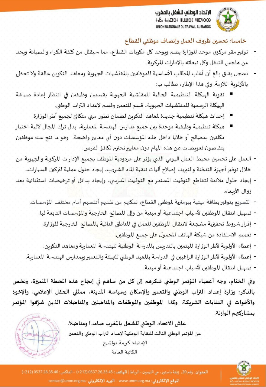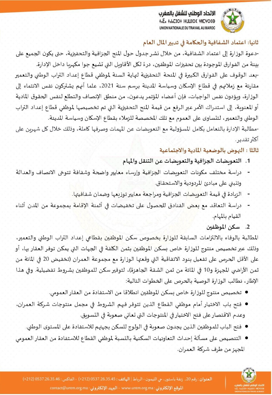 كما طالبت بإعطاء الأولوية لأطر الوزارة الراغبين في الدراسة بالمعهد الوطني للتهيئة والتعمير وبمدارس الهندسة المعمارية، وتسهيل انتقال الموظفين لأسباب اجتماعية أو مهنية.