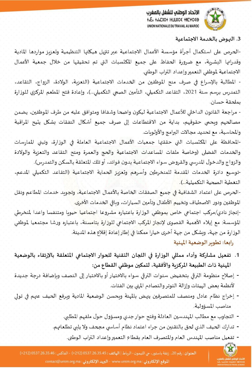 وطالبت بالإسراع في صرف منح الموظفين من الخدمات الاجتماعية (التعزية، الولادة، الزواج، التقاعد، التمدرس برسم سنة 2021، التقاعد التكميلي، التأمين الصحي التكميلي…)، وإعادة فتح المطعم المركزي للوزارة بملحقة حسان، ومراجعة القانون الداخلي للأعمال الاجتماعية ليكون واضحا وشفافا ومتوافق عليه من طرف الموظفين، يضمن مصالحهم ويحمي حقوقهم، بداية من الاقتطاعات إلى صرف جميع أشكال النفقات بشكل يتيح المراقبة والمحاسبة، مع تحديد مجالات البرامج والأولويات، والمحافظة على المكتسبات التي حققتها جمعيات الأعمال الاجتماعية العاملة في الوزارة، وتبني الممارسات والخدمات الفضلى (وخاصة ملفات المساعدات الاجتماعية والحج والعمرة ومنح التقاعد والتعزية والولادة والزواج والدخول المدرسي والقروض سواء الاجتماعية بدون فوائد، أو تلك المتعلقة بالسكن والتمدرس).