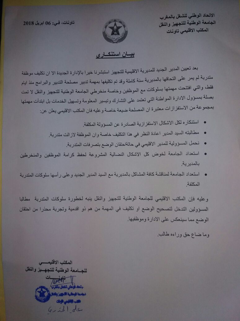 وطالب المكتب الإقليمي المدير إعادة النظر في هذا التكليف خاصة وان الموظفة لازالت متدربة، محملا كامل المسؤولية للمدير الإقليمي في حالة احتقان الوضع بتصرفات المتدربة، ومعلنا استعداد الجامعة لخوض كل الأشكال النضالية المشروعة لحفظ كرامة الموظفين والمنخرطين بالمديرية.