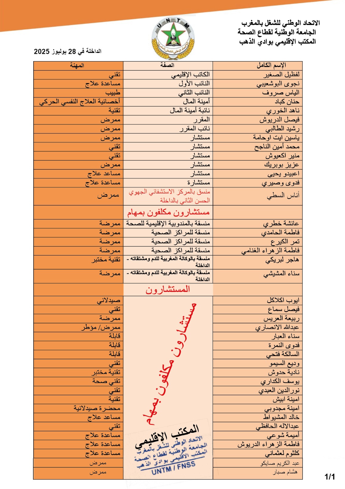 تم يوم السبت 26 يوليوز 2025، تجديد المكتب الإقليمي للجامعة الوطنية لقطاع الصحة، المنضوية تحت لواء الاتحاد الوطني للشغل بالمغرب، بجهة الداخلة وادي الذهب، خلال مؤتمر إقليمي انعقد بمقر نقابة الاتحاد الوطني للشغل بالمغرب بمدينة الداخلة.