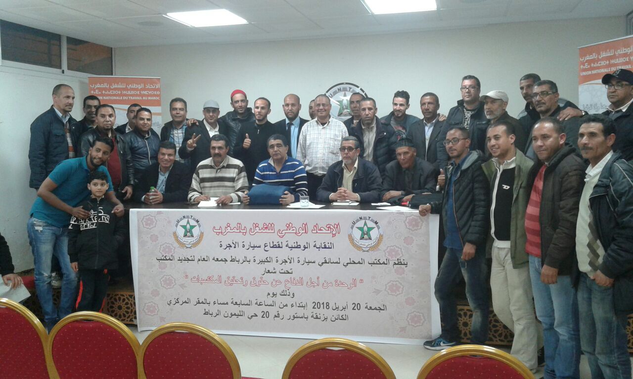 عقد المكتب المحلي للنقابة الوطنية لقطاع سيارات الأجرة المنضوية تحت لواء الاتحاد الوطني للشغل بالمغرب، بالرباط، الجمعة 20 أبريل 2018، جمعه العام تحت شعار ” الوحدة من أجل الدفاع عن حقوق وتحقيق المكتسبات”، بالمقر المركزي للاتحاد بالرباط، من أجل تجديد المكتب.