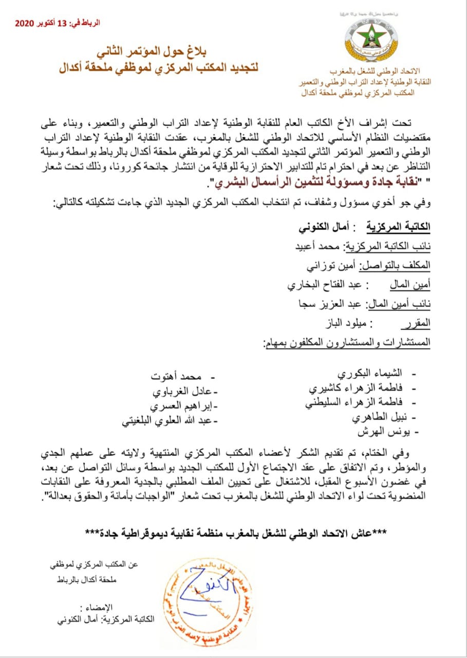 وفي جو أخوي مسؤول وشفاف، تم خلال المؤتمر الذي أشرف عليه الأخ الكاتب العام للنقابة، وبناء على مقتضيات النظام الأساسي للاتحاد الوطني للشغل بالمغرب، (تم) انتخاب المكتب المركزي الجديد الذي جاءت تشكيلته كالتالي: