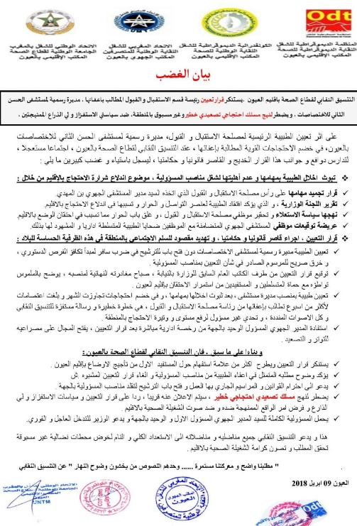 طالب تنسيق نقابي في قطاع الصحة بجهة العيون الساقية الحمراء، بمحاسبة المدير الجهوي للصحة بالجهة وتحميله مسؤولية ما سيؤول إليه الوضع نتيجة لاحتقان الوضع خاصة بعد استصداره من الكاتب العام للوزارة بالنيابة ومدير الموارد البشرية المنتهية ولايته يوم 06 أبريل 2018، مقرر يتم بموجبه تعيين طبيبة بصفة رسمية رئيسة لمستشفى الحسن الثاني للاختصاصات بالعيون دون فتح باب الترشيحات.