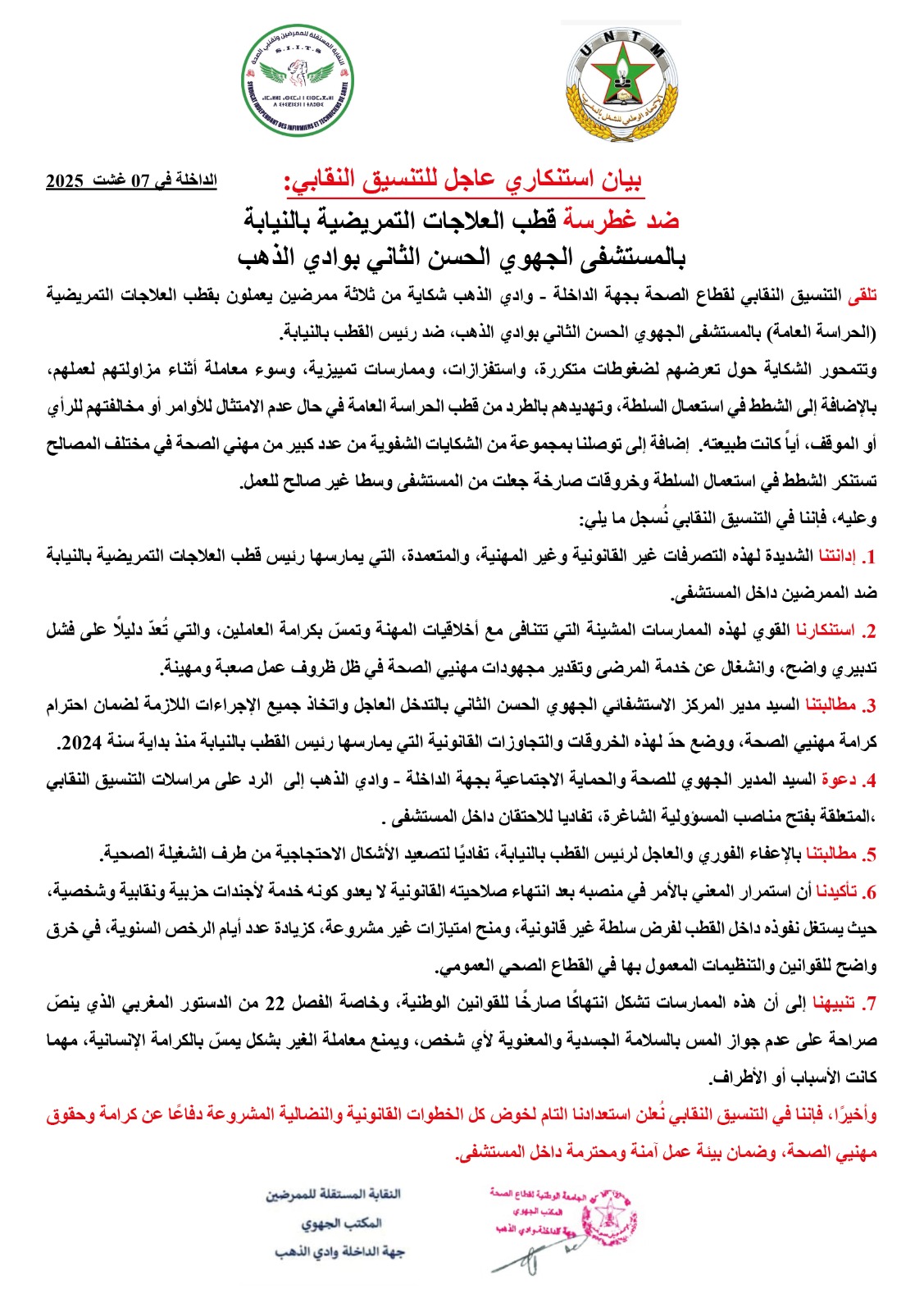 استنكر تنسيق نقابي بقطاع الصحة بجهة الداخلة – وادي الذهب، يضم الجامعة الوطنية لقطاع الصحة بالجهة، ما وصفه بـ”الخروقات الخطيرة والشطط في استعمال السلطة” الصادرة عن رئيس قطب العلاجات التمريضية بالنيابة بالمستشفى الجهوي الحسن الثاني بالداخلة.
