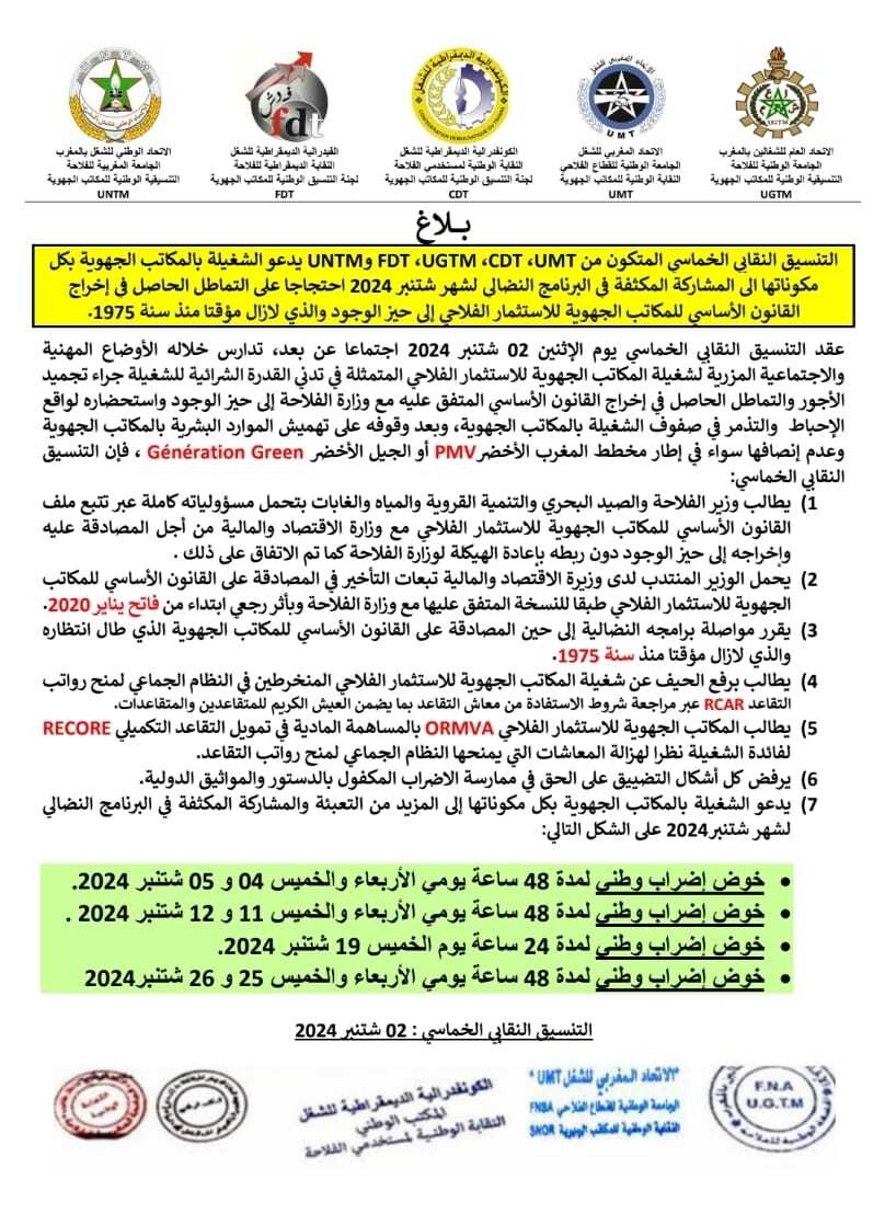 دعا تنسيق نقابي خماسي في قطاع الفلاحة يضم الجامعة المغربية للفلاحة untm، الشغيلة بالمكاتب الجهوية بكل مكوناتها إلى المزيد من التعبئة والمشاركة المكثفة في البرنامج النضالي لشهر شتنبر2024 .