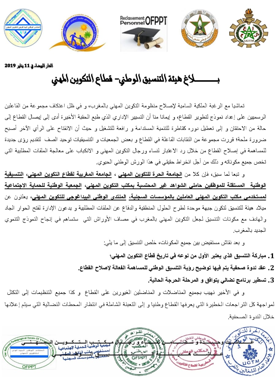 ودعا التنسيق الذي يعد الأول من نوعه في تاريخ قطاع التكوين المهني، الإدارة لفتح الحوار الجاد والهادف مع مكونات التنسيق لجعل التكوين المهني في المغرب في مصاف الأوراش التي ستساهم في إنجاح النموذج التنموي الجديد بالمغرب.