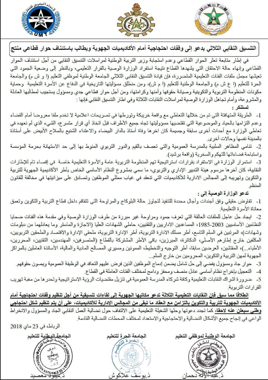 دعا تنسيق نقابي ثلاثي يضم الجامعة الوطنية لموظفي التعليم، المنضوية تحت لواء الاتحاد الوطني للشغل بالمغرب، والجامعة الحرة للتعليم (ا ع ش م) والجامعة الوطنية للتعليم (ا م ش)، مكاتبه الجهوية إلى لقاءات تنسيقية من أجل تنظيم وقفات احتجاجية أمام الأكاديميات الجهوية للتربية والتكوين إلى وقفات احتجاجية أمام الأكاديميات الجهوية احتجاجا على تعثر الحوار القطاعي وعدم استجابة وزير التربية الوطنية لمراسلات التنسيق النقابي من أجل استئناف الحوار القطاعي لإنهاء حالة الاحتقان التي يشهدها القطاع نتيجة استفراد الوزارة الوصية بالقرار التعليمي.