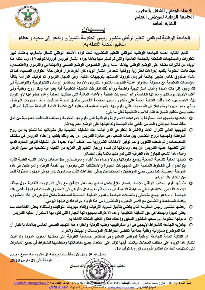 وأعلنت الجامعة رفضها لمنشور رئيس الحكومة الذي يقضي بتأجيل تسوية الترقيات وإلغاء مباريات التوظيف واستثناء بعض القطاعات مما يعتبر تمييزا واجحافا في حق الشغيلة التعليمية وعدم الاعتراف بمجهوداتها الجبارة التي تقوم بها لاستمرار عملية التدريس، داعية الحكومة إلى سحب المنشور السابق وإعطاء قطاع التعليم المكانة اللائقة به.