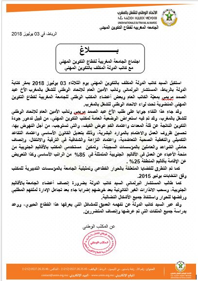 وتم خلال اللقاء الذي جاء جوابا على طلب الأخ عبد الصمد مريمي ، استعراض الوضعية العامة لمكتب التكوين المهني، من قبيل تدهور جودة التكوين الناتجة عن قلة المعدات واعتماد الكم عوض الكيف، والعديد من المشاكل التي يعرفها القطاع، كما اقترحت الجامعة مجموعة من الحلول للنهوض بالقطاع وتحسين ظروف العمل والاهتمام بالموارد البشرية، وذلك بتعديل القانون الأساسي واعتماد التقاعد التكميلي والتغطية الصحية التعاضدية، والنزاهة والشفافية في الترقية والانتقال وإنصاف حاملي الشواهد والعاملين بالمؤسسات السجينة، وتمكين مستخدمي المكتب بالأقاليم الجنوبية من منحة الأعباء عن العمل في الأقاليم الجنوبية المتمثلة في 85% من الراتب الأساسي وكذا التعويض عن الإقامة بأقاليم المنطقة 25%.