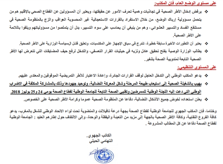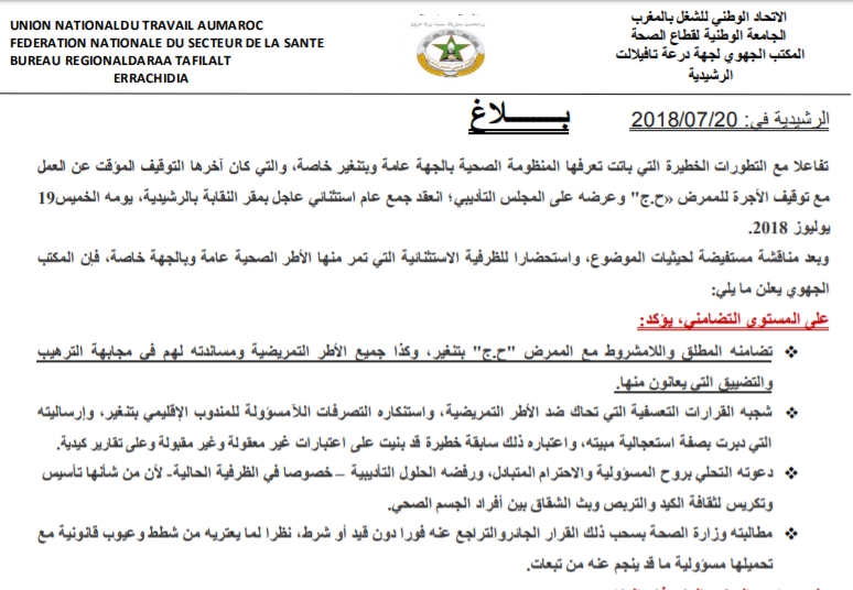 وطالب المكتب في بلاغ له عقب جمع عام استثنائي عاجل بمقر النقابة بالرشيدية لتدارس التطورات الخطيرة التي باتت تعرفها المنظومة الصحية بالجهة عامة وبتنغير خاصة، والتي كان آخرها التوقيف المؤقت عن العمل مع توقيف الأجرة للممرض «ح.ج” وعرضه على المجلس التأديبي، (طالب) وزارة الصحة بسحب ذلك القرار الجائر والتراجع عنه فورا دون قيد أو شرط، نظرا لما يعتريه من شطط وعيوب قانونية مع تحميلها مسؤولية ما قد ينجم عنه من تبعات.