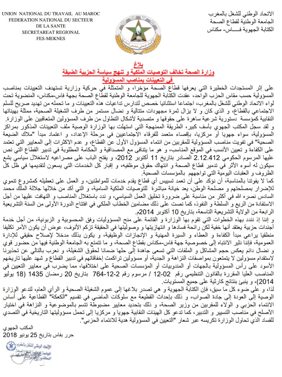استنكرت الكتابة الجهوية للجامعة الوطنية لقطاع الصحة بجهة فاس-مكناس، المنضوية تحت لواءالاتحاد الوطني للشغل بالمغرب، المستجدات الخطيرة التي يعرفها قطاع الصحة مؤخرا، و المتمثلة في حركية وزارية تستهدف التعيينات بمناصب المسؤولية حسب مقاس الحزب الواحد.