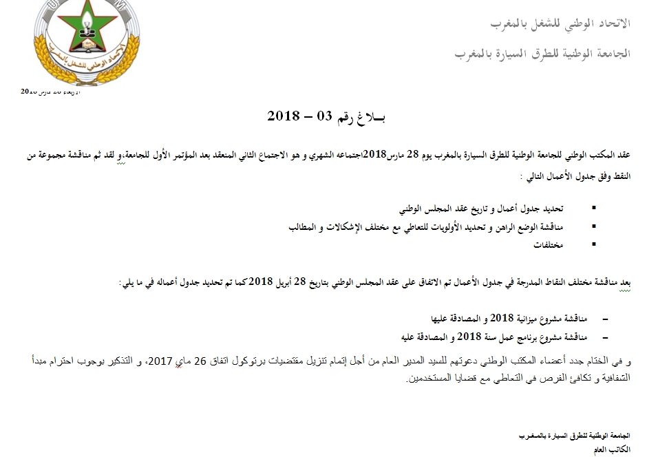وبعد مناقشة مختلف النقاط المدرجة في جدول الأعمال تم الاتفاق على عقد المجلس الوطني بتاريخ 28 أبريل 2018 كما تم تحديد جدول أعماله في مناقشة مشروع ميزانية 2018 و المصادقة عليها، ومناقشة مشروع برنامج عمل سنة 2018 و المصادقة عليه.