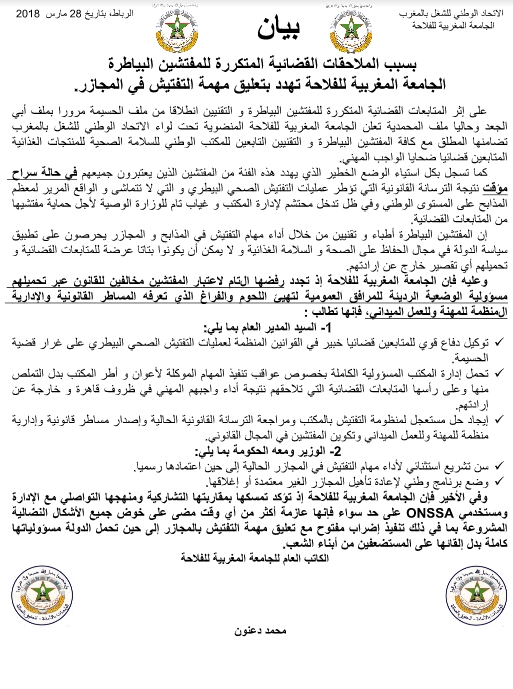 وعبرت الجامعة في بيان لها عن استيائها للوضع الخطير الذي يهدد هذه الفئة من المفتشين الذين يعتبرون جميعهم في حالة سراح مؤقت نتيجة الترسانة القانونية التي تؤطر عمليات التفتيش الصحي البيطري و التي لا تتماشى و الواقع المرير لمعظم المذابح على المستوى الوطني وفي ظل تدخل محتشم لإدارة المكتب و غياب تام للوزارة الوصية لأجل حماية مفتشيها من المتابعات القضائية.
