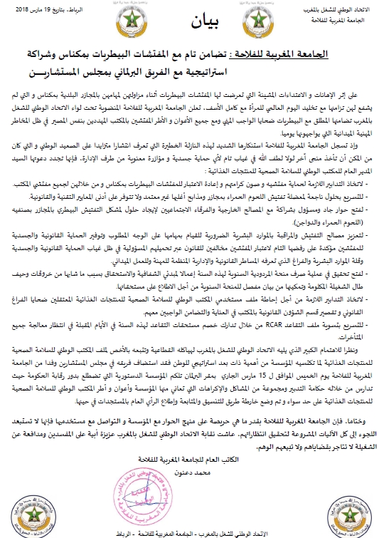 ودعت الجامعة في بيان لها، المدير العام للمكتب الوطني للسلامة الصحية للمنتجات الغذائية، لاتخاذ التدابير اللازمة لحماية مفتشيه وصون كرامتهم وإعادة الاعتبار للمفتشات البيطريات بمكناس ومن خلالهن لجميع مفتشي المكتب، والتسريع بحلول ناجعة لمعضلة تفتيش اللحوم الحمراء بمجازر ومذابح أغلبها غير معتمد ولا تتوفر على أدنى المعايير التقنية والقانونية.