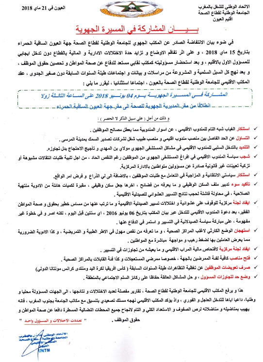 قرر المكتب الإقليمي للجامعة الوطنية لقطاع الصحة المنضوية تحت لواء الاتحاد الوطني للشغل بالمغرب، المشاركة في المسيرة الجهوية التي ستنظم 4 يونيو 2018، انطلاقا من المديرية الجهوية للصحة إلى مقر جهة العيون الساقية الحمراء، احتجاجا على تفاقم الأوضاع وتزايد حدة الاختلالات الإدارية والمالية بالقطاع دون تدخل إيجابي للمسؤول الأول عن القطاع بالإقليم.