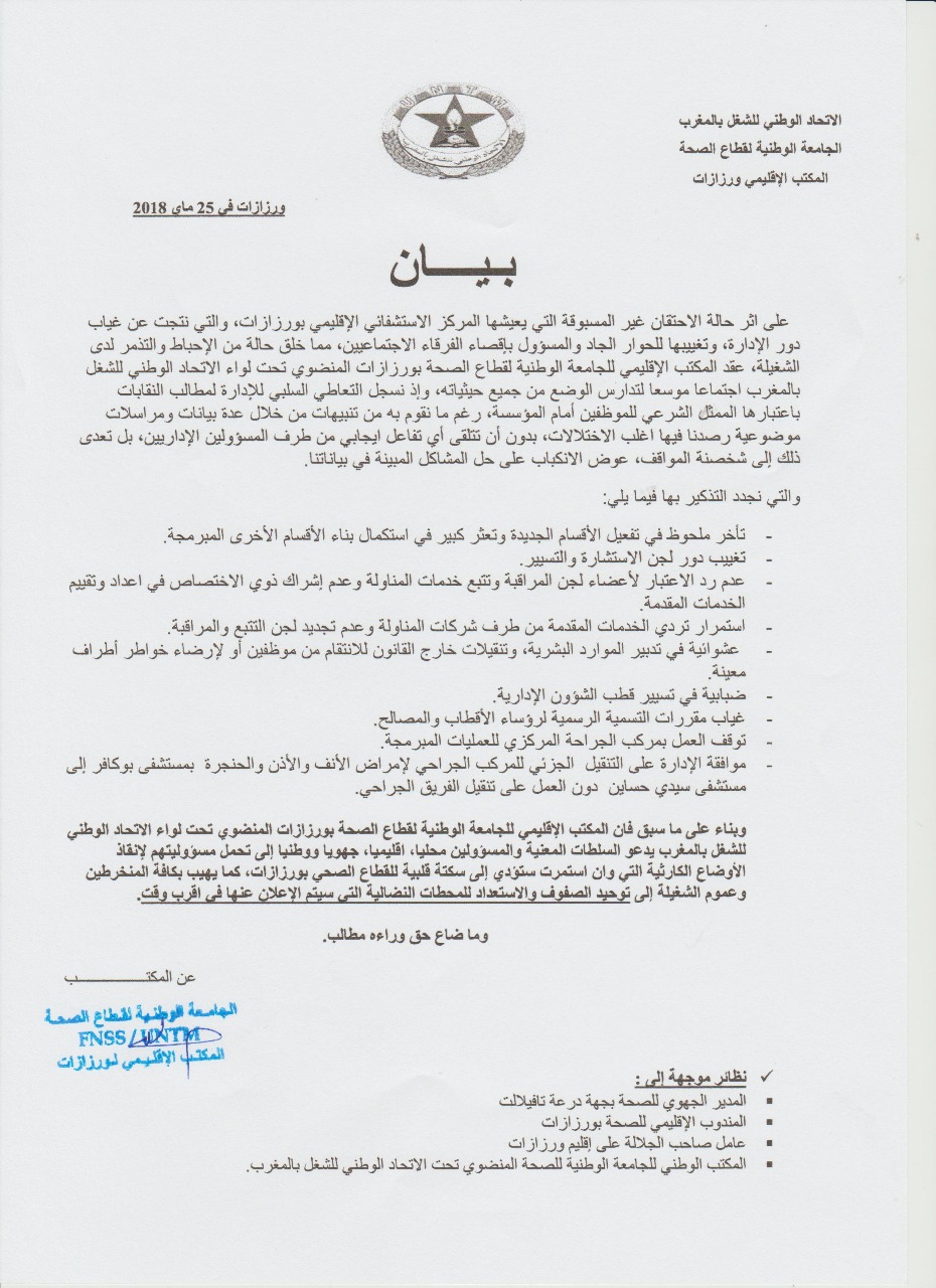 دعا المكتب الإقليمي للجامعة الوطنية لقطاع الصحة بورزازات، المنضوي تحت لواء الاتحاد الوطني للشغل بالمغرب، السلطات المعنية والمسؤولين محليا، وإقليميا، وجهويا ووطنيا إلى تحمل مسؤوليتهم لإنقاذ الأوضاع الكارثية التي التي يعيشها المركز الاستشفائي الإقليمي بورزازات، محذرا من انعكاس ذلك على القطاع الصحي بالمدينة.