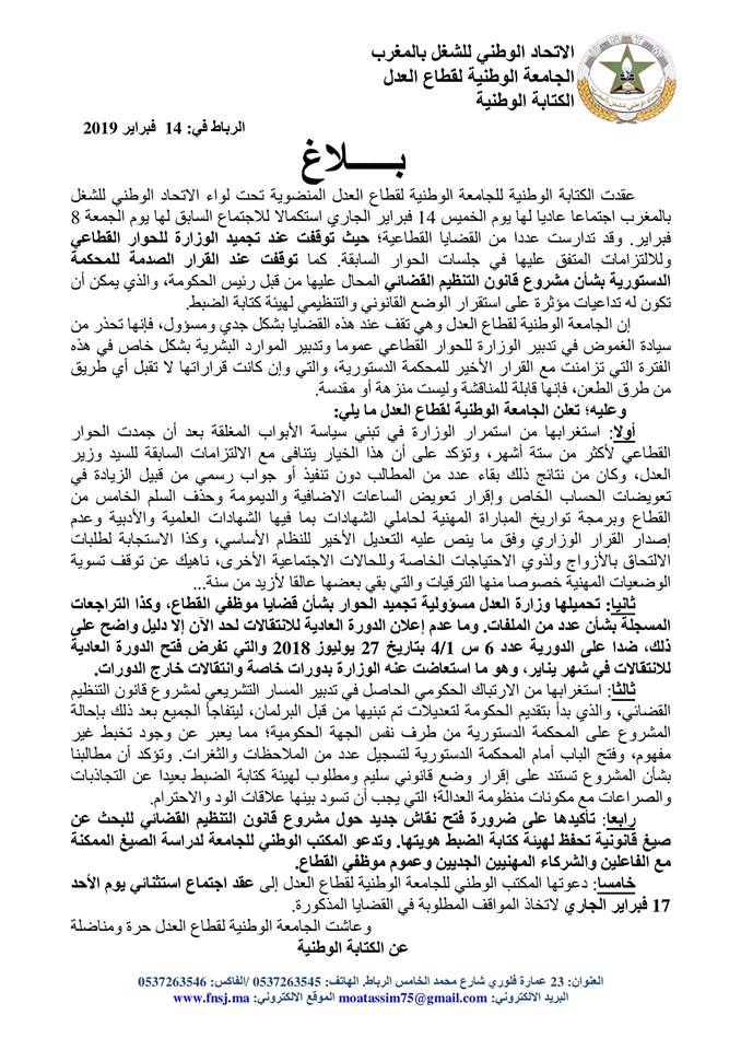 وسجلت الجامعة خلال انعقاد كتابتها الوطنية الخميس 14 فبراير 2019، استغرابها من استمرار الوزارة في تبني سياسة الأبواب المغلقة بعد أن جمدت الحوار القطاعي لأكثر من ستة أشهر، مؤكدة على أن هذا الخيار يتنافى مع الالتزامات السابقة لوزير العدل.