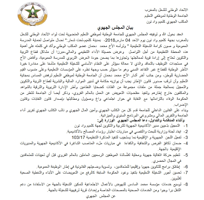 طالب المكتب الجهوي للجامعة الوطنية لموظفي التعليم بجهة كلميم واد نون، المنضوية تحت لواء الاتحاد الوطني للشغل بالمغرب، وزارة التربية الوطنية، بالتعجيل بتعيين مدير الأكاديمية الجهوية للتربية والتكوين للجهة، وايفاد لجنة وزارية للبحث والتقصي في مباريات اختيار رؤساء المصالح بالأكاديمية.