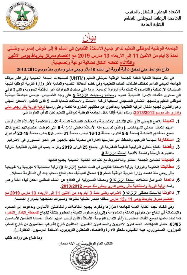دعت الجامعة الوطنية لموظفي التعليم المنضوية تحت لواء الاتحاد الوطني للشغل بالمغرب، جميع الأساتذة القابعين في السلم 9 إلى خوض إضـراب وطــني لمدة 3 أيام من الإثنين 11 إلى الأربعاء 13 مارس 2019 مع اعتصام ممركز بالرباط يومي الإثنين والثلاثاء تتخلله أشكال نضالية نوعية وتصعيدية.