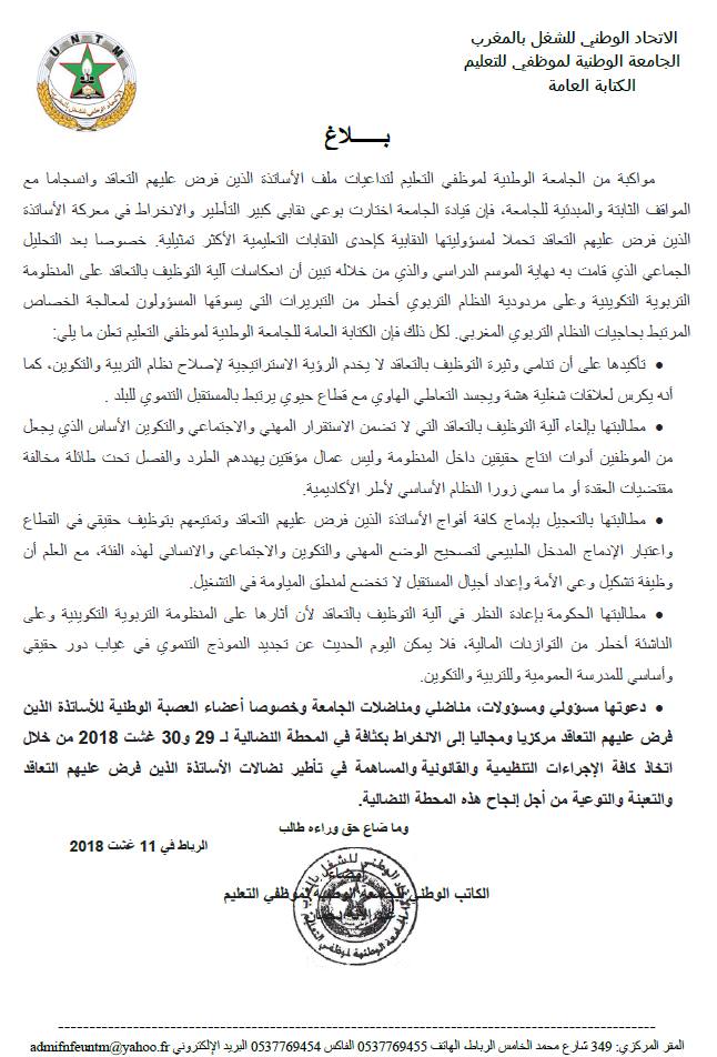 وقالت الجامعة حسب البلاغ، إنها اختارت بوعي نقابي كبير التأطير والانخراط في معركة الأساتذة الذين فرض عليهم التعاقد تحملا لمسؤوليتها النقابية كإحدى النقابات التعليمية الأكثر تمثيلية، خصوصا بعد التحليل الجماعي الذي قامت به نهاية الموسم الدراسي والذي من خلاله تبين أن انعكاسات آلية التوظيف بالتعاقد على المنظومة التربوية التكوينية وعلى مردودية النظام التربوي أخطر من التبريرات التي يسوقها المسؤولون لمعالجة الخصاص المرتبط بحاجيات النظام التربوي المغربي.