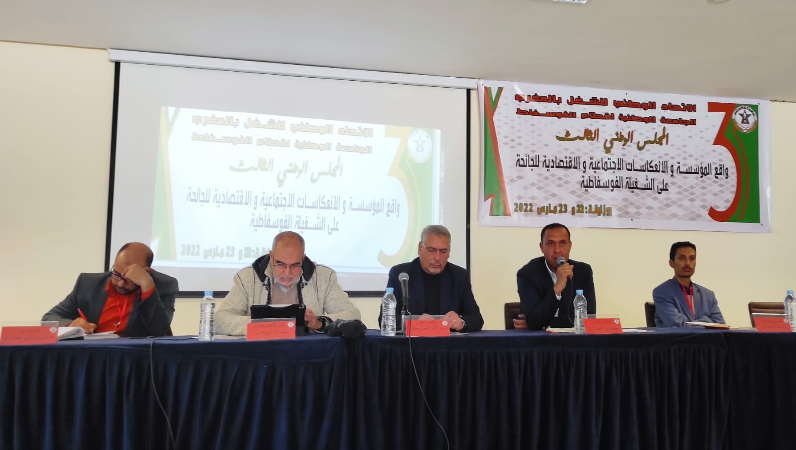 انعقد الثلاثاء 22 مارس 2022 بمركب الشباب والطفولة ببوزنيقة، المجلس الوطني للجامعة الوطنية لقطاع الفوسفاط التابعة للاتحاد الوطني للشغل بالمغرب، تحت شعار “واقع المؤسسة والانعكاسات الاجتماعية والاقتصادية للجائحة على الشغيلة الفوسفاطية”.