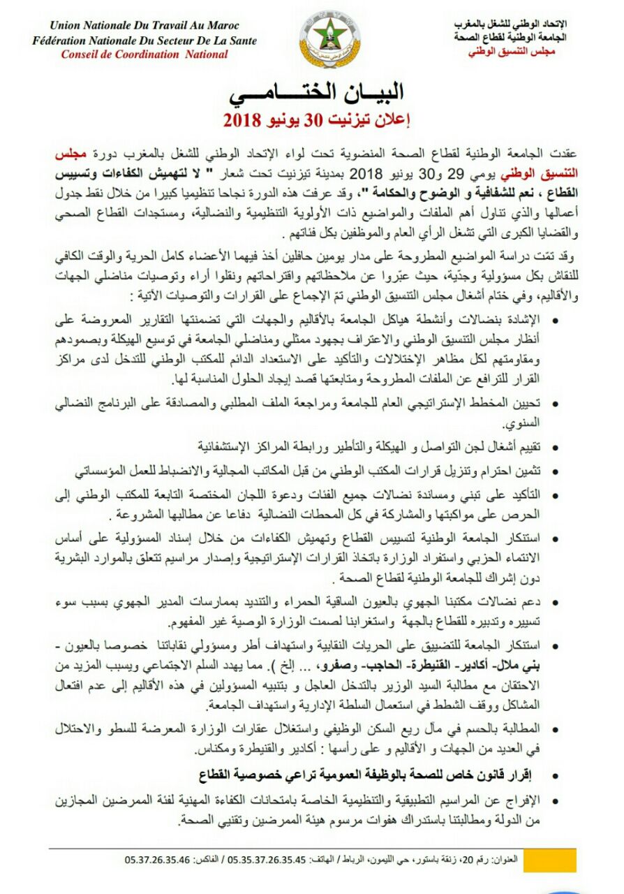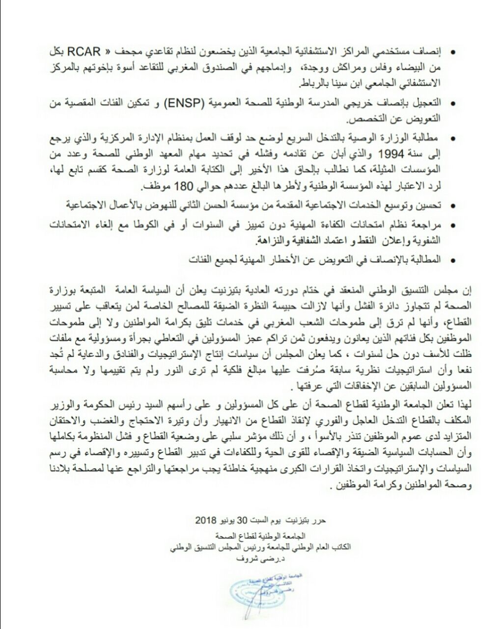 ودعت الجامعة إلى الاستجابة للمطالب المشروعة لكل الفئات وتسوية الملفات العالقة مع إعادة النظر في تسيير الموارد البشرية، مطالبة الوزير بالتدخل العاجل وتصحيح الوضع ضد الاستهتار بالمشاريع الملكية في طور الإنجاز بكل من تمارة والقنيطرة، ومراجعة القرار التعسفي للجنة البحث التمهيدي للسيدة المندوبة للصحة على إقليم القنيطرة في حق مناضلي الجامعة .