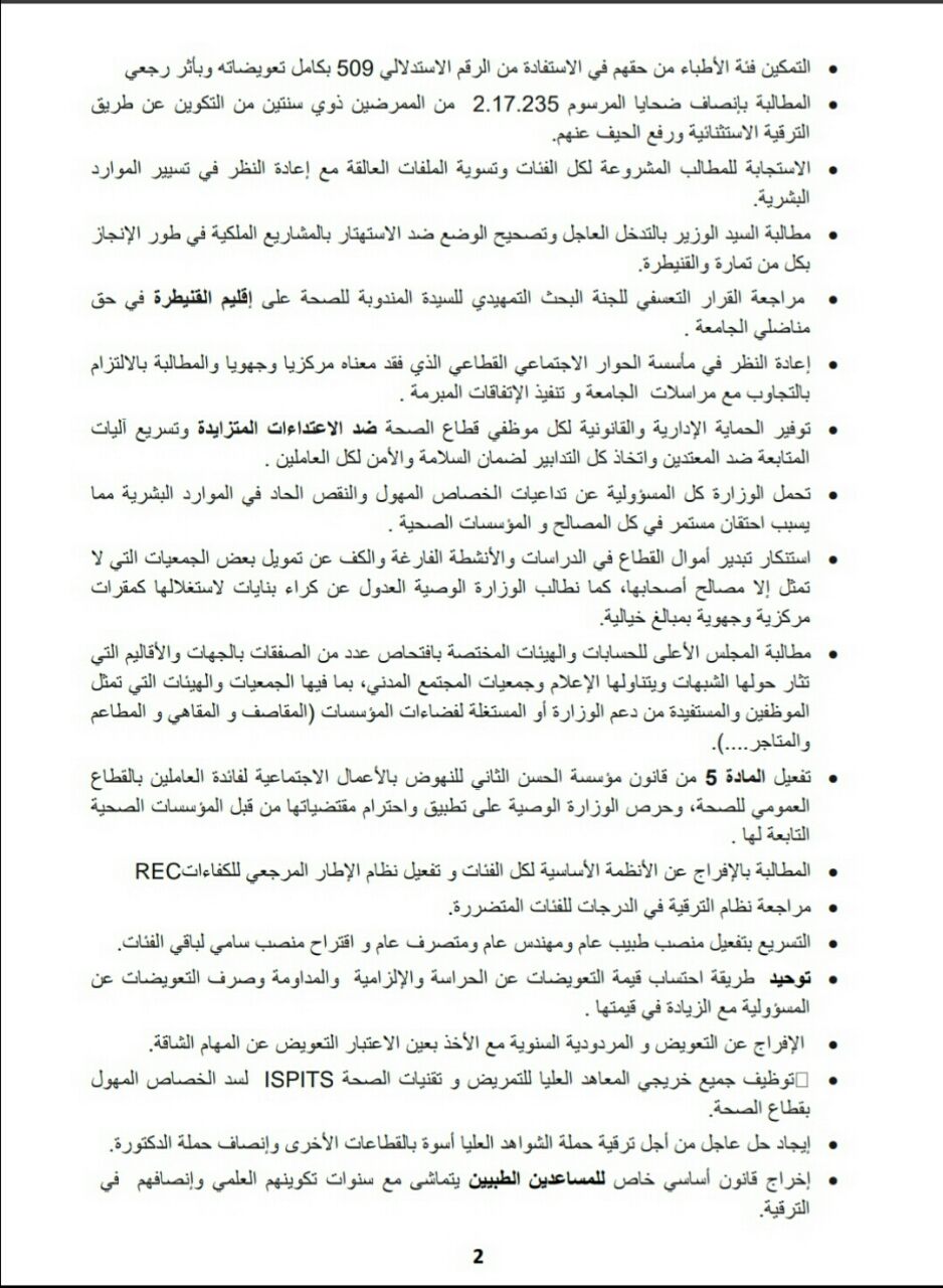 وطالبت بالإفراج عن المراسيم التطبيقية والتنظيمية الخاصة بامتحانات الكفاءة المهنية لفئة الممرضين المجازين من الدولة ومطالبتنا باستدراك هفوات مرسوم هيئة الممرضين وتقنيي الصحة، وتمكين فئة الأطباء من حقهم في الاستفادة من الرقم الاستدلالي 509 بكامل تعويضاته وبأثر رجعي، وإنصاف ضحايا المرسوم 2.17.235 من الممرضين ذوي سنتين من التكوين عن طريق الترقية الاستثنائية ورفع الحيف عنهم.