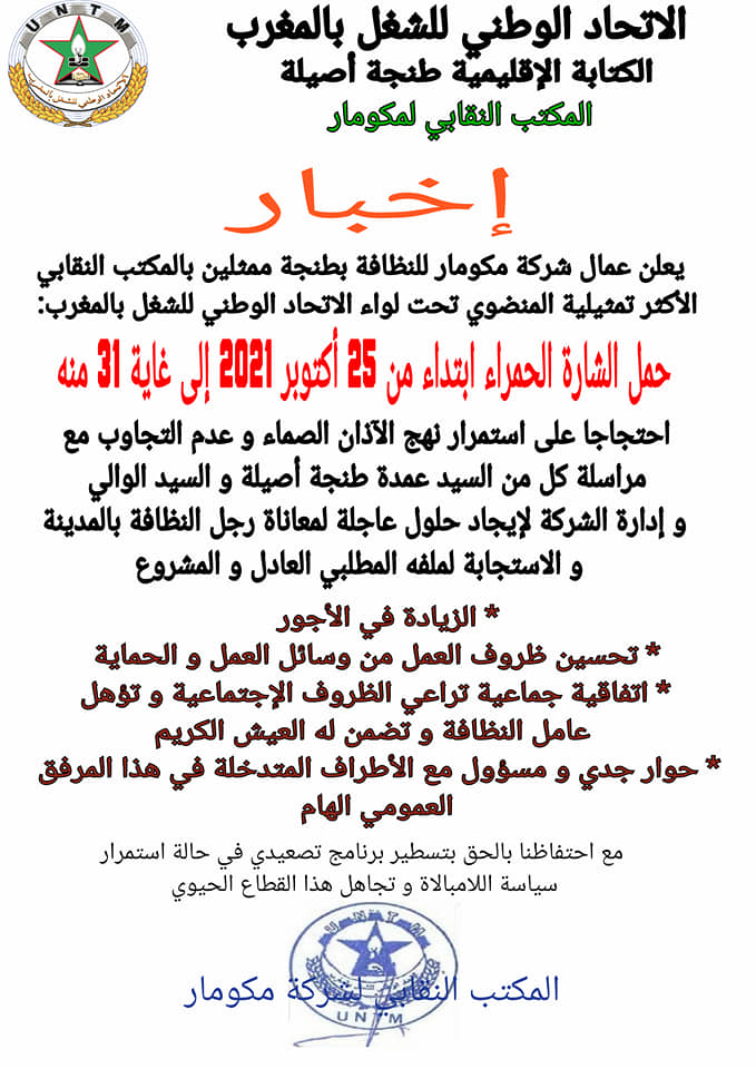 أعلن عمال شركة مكومار للنظافة بطنجة ممثلين بالمكتب النقابي الأكثر تمثيلية المنضوي تحت لواء الاتحاد الوطني للشغل بالمغرب، عن حمل الشارة الحمراء ابتداء من 25 أكتوبر 2021، إلى غاية 31 منه، وذلك احتجاجا على نهج الآذان الصماء وعدم التجاوب مع مراسلة كل من عمدة طنجة أصيلة والوالي، وإدارة الشركة لإيجاد حلول عاجلة لمعاناة رجل النظافة بالمدينة والاستجابة لملفه المطلبي العادل والمشروع.