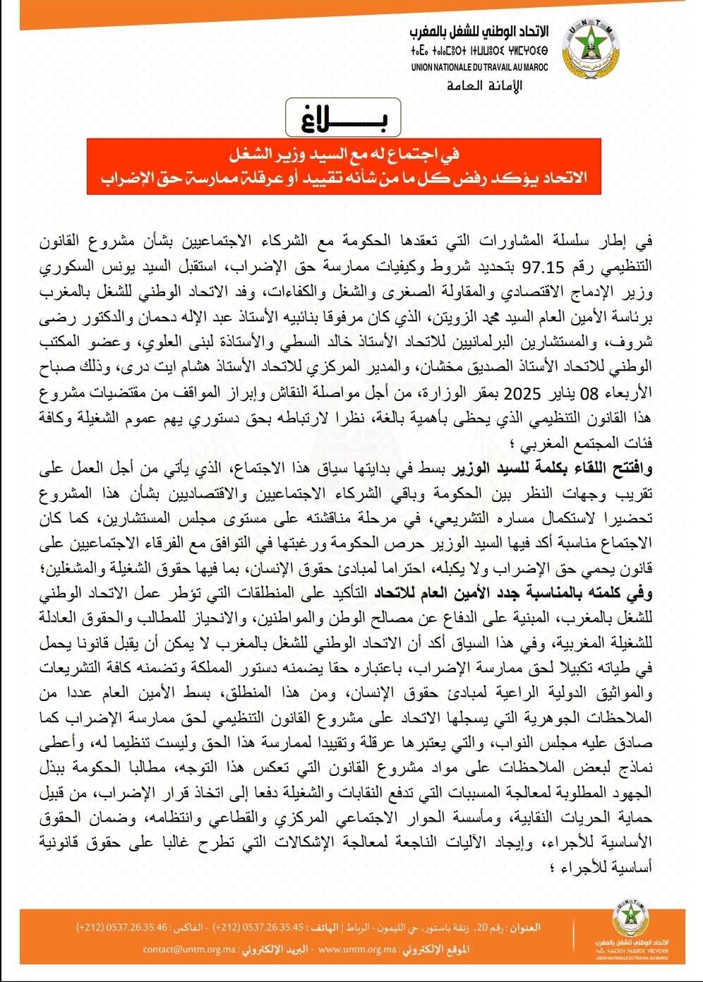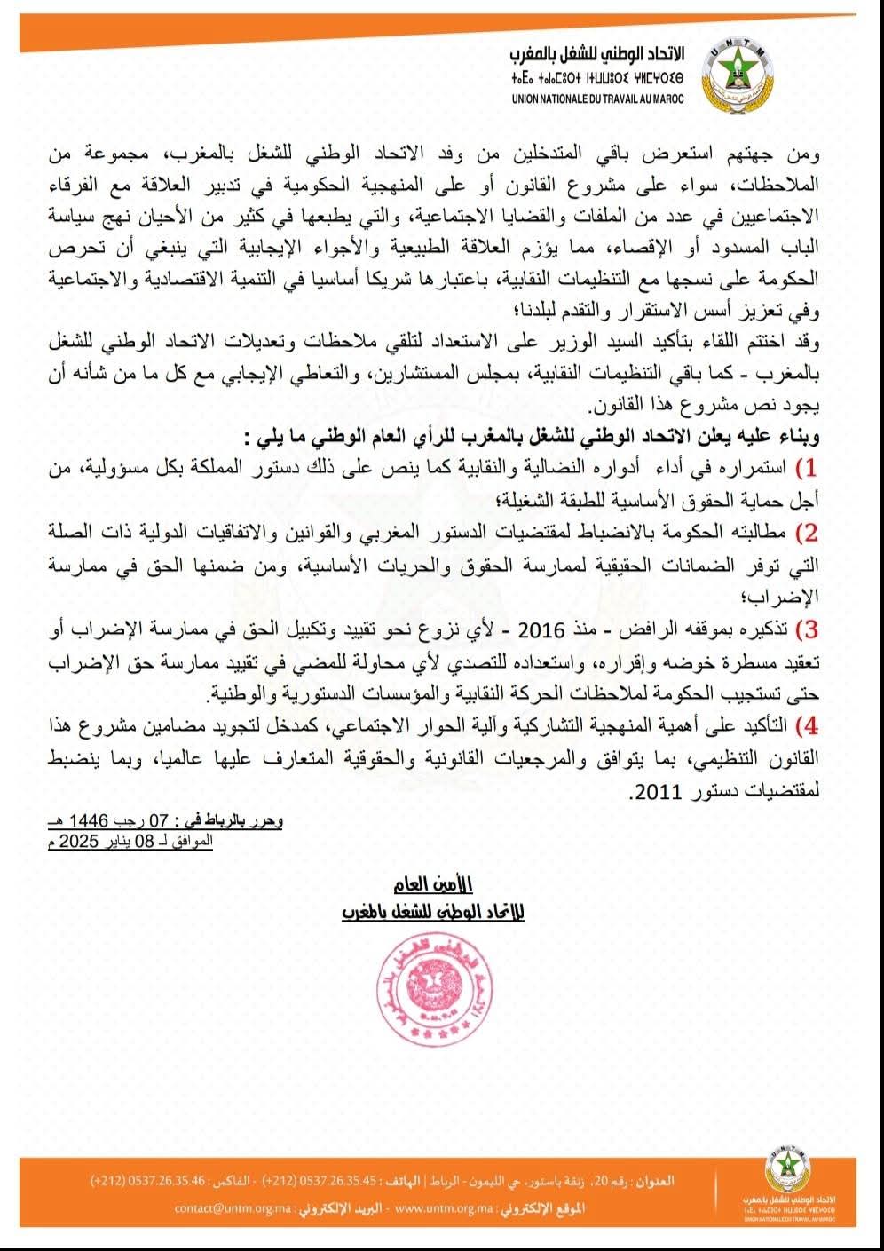 هذا وأعلن الاتحاد الوطني للشغل بالمغرب استمراره في أداء أدواره النضالية والنقابية كما ينص على ذلك دستور المملكة بكل مسؤولية، من أجل حماية الحقوق الأساسية للطبقة الشغيلة.