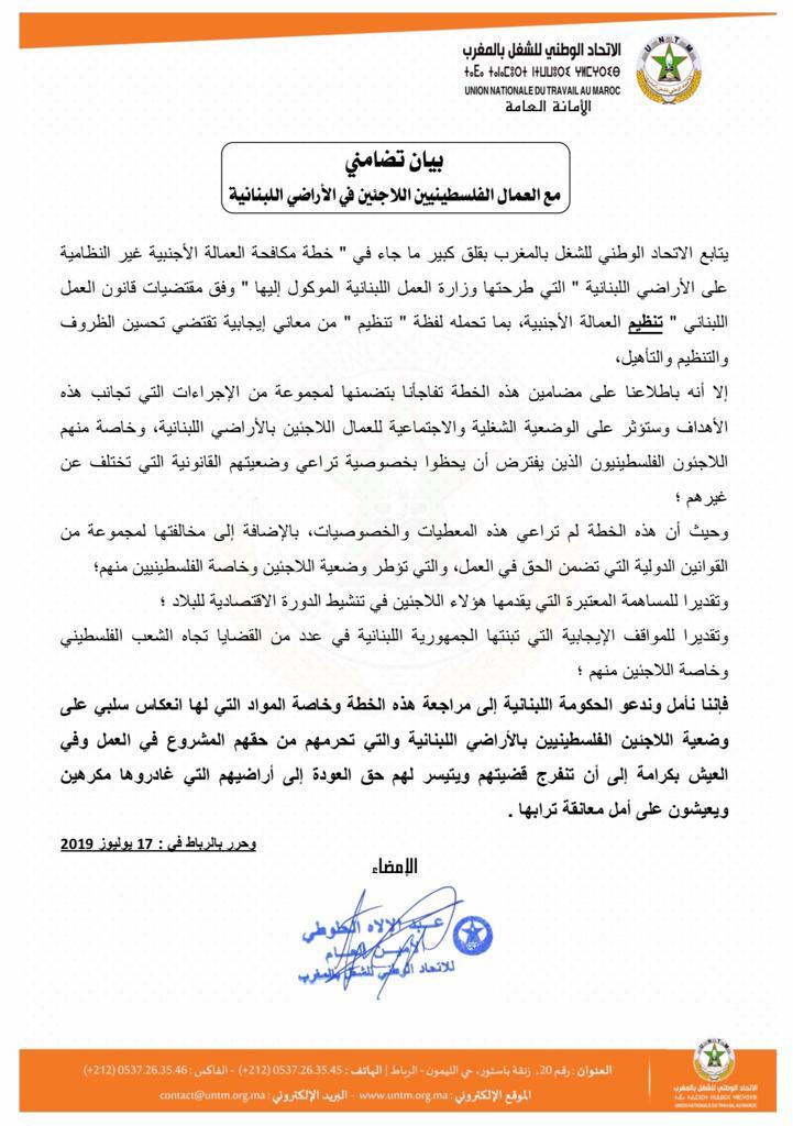 عبر الاتحاد الوطني للشغل بالمغرب عن تضامنه مع العمال الفلسطينيين اللاجئين في الأراضي اللبنانية على إثر ” خطة مكافحة العمالة الأجنبية غير النظامية على الأراضي اللبنانية ” التي طرحتها وزارة العمل اللبنانية الموكول إليها ” وفق مقتضيات قانون العمل اللبناني ” تنظيم العمالة الأجنبية.