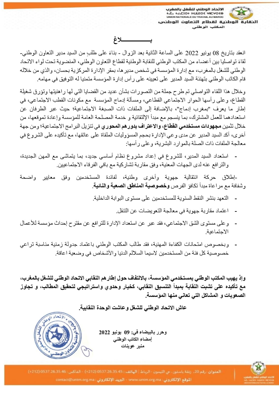 بناء على طلب مدير مؤسسة التعاون الوطني انعقد، 8 يونيو 2022، لقاء تواصليا بين أعضاء عن المكتب الوطني للنقابة الوطنية لقطاع التعاون الوطني، المنضوية تحت لواء الاتحاد الوطني للشغل بالمغرب، مع إدارة المؤسسة في شخص مديرها.