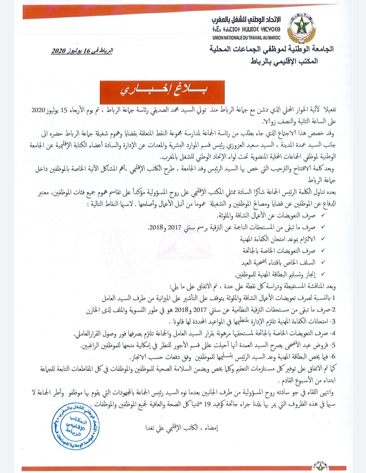 تفعيلا لآلية الحوار المحلي الذي دشن مع جماعة الرباط منذ تولي السيد محمد الصديقي رئاسة جماعة الرباط ، تم يوم الأربعاء 15 يوليوز2020 التقى وفد من الكتابة الإقليمية للجامعة الوطنية لموظفي الجماعات المحلية بالرباط امنضوية تحت لواء الاتحاد الوطني للشغل بالمغرب.