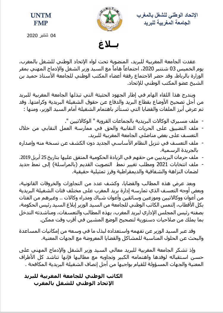 عقدت الجامعة المغربية للبريد، المنضوية تحت لواء الإتحاد الوطني للشغل بالمغرب، الخميس 03 شتنبر 2020، اجتماعاً هاماً مع وزير الشغل والإدماج المهني بمقر الوزارة بالرباط، وقد حضر الاجتماع رفقة أعضاء المكتب الوطني للجامعة الأستاذ حميد بن الشيخ عضو المكتب الوطني للإتحاد.