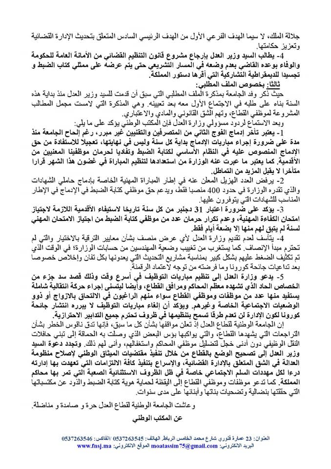 ودعت، وزارة العدل إلى تنظيم مباريات التوظيف في أسرع وقت وذلك قصد سد جزء من الخصاص الحاد الذي تشهده معظم المحاكم ومرافق القطاع، وأيضا ليتسنى إجراء حركة انتقالية شاملة يستفيد منها عدد من موظفات وموظفي القطاع سواء منهم الراغبون في الالتحاق بالازواج أو ذوو الوضعيات الاجتماعية الخاصة وغيرهم. ويؤكد أن إلغاء مباريات التوظيف لا يبرره انتشار جائحة كورونا لكون الإدارة لن تعدم طرقا تسمح بتنظيمها في ظروف تحترم جميع التدابير الاحترازية.