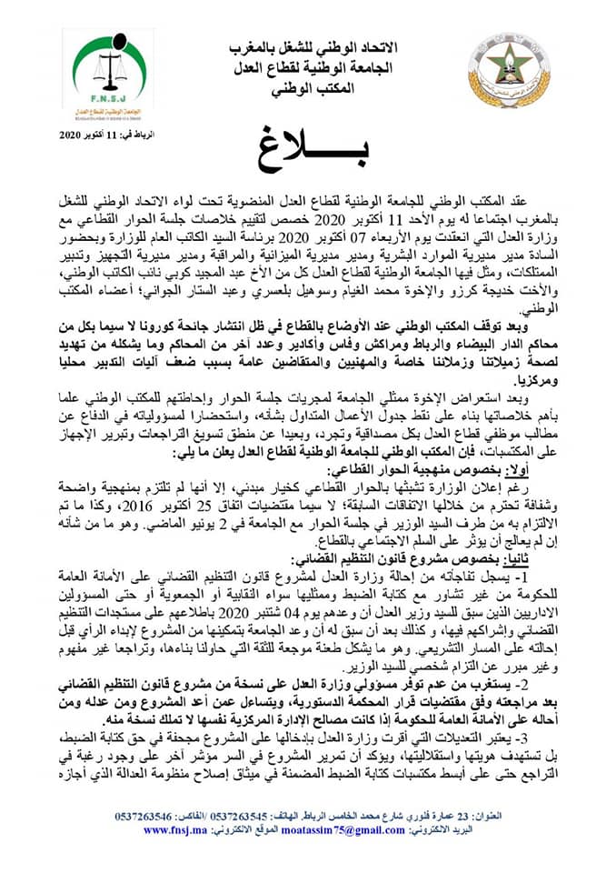 عقد المكتب الوطني للجامعة الوطنية لقطاع العدل المنضوية تحت لواء الاتحاد الوطني للشغل بالمغرب، الأحد 11 أكتوبر 2020،اجتماعا، خصص لتقييم خلاصات جلسة الحوار القطاعي مع وزارة العدل التي انعقدت يوم الأربعاء 07 أكتوبر 2020 برئاسة الكاتب العام للوزارة وبحضور مدير مديرية الموارد البشرية ومدير مديرية الميزانية والمراقبة ومدير مديرية التجهيز وتدبير الممتلكات، ومثل فيها الجامعة كل من الأخ عبد المجيد كوبي نائب الكاتب الوطني، والأخت خديجة كرزو والإخوة محمد الغيام وسوهيل بلعسري وعبد الستار الجواني؛ أعضاء المكتب الوطني.